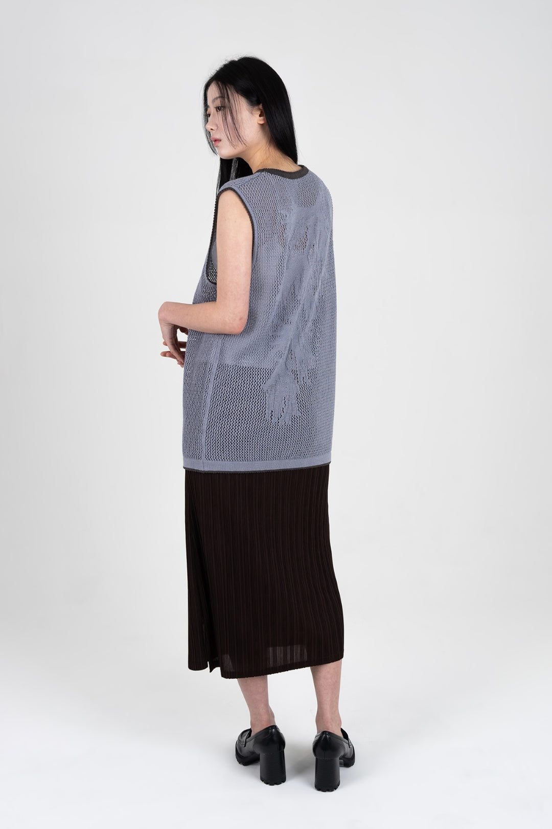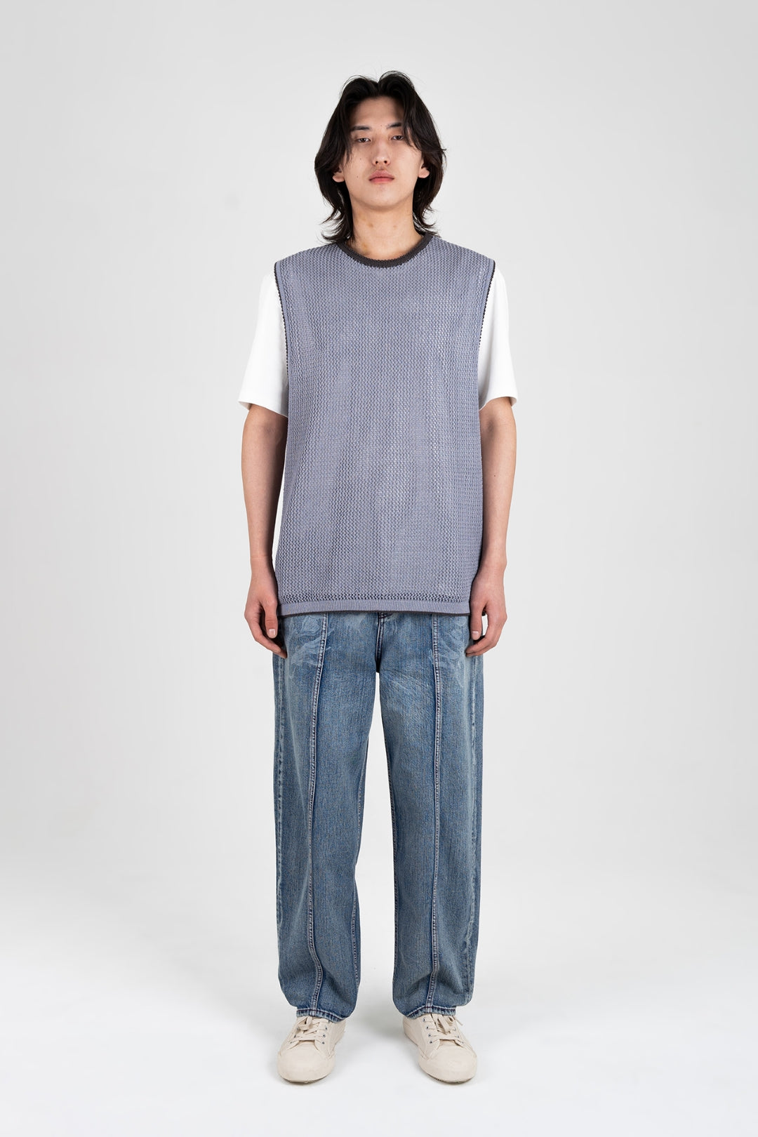 Product Description: The design captures the fleeting memories of a hometown, falling like flowers, alongside the new city’s life, ripening like fruit. The mesh vest, designed to offer relief from the heat, symbolises these moments by filling each mesh opening with meaning. Vintage colour contrasts and a textured knit pattern adorn the sleeve ends and hem, adding depth to the piece.