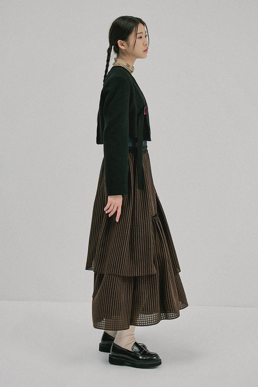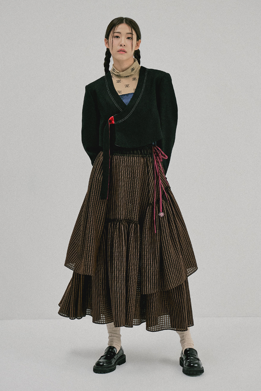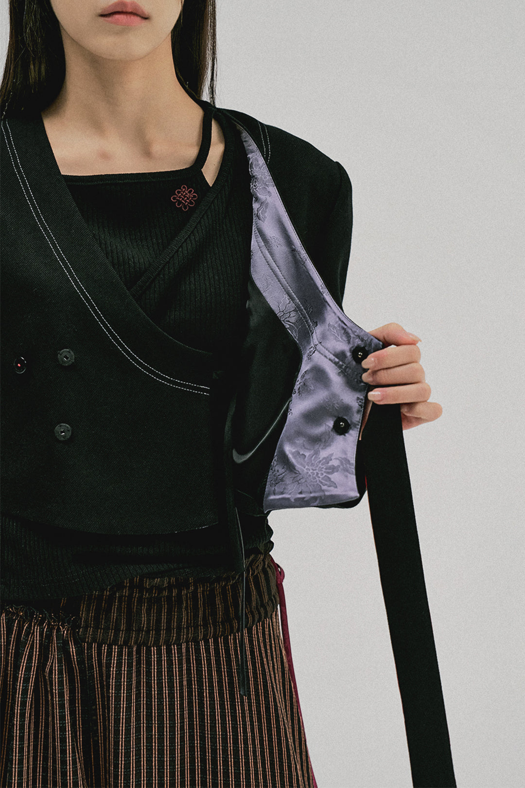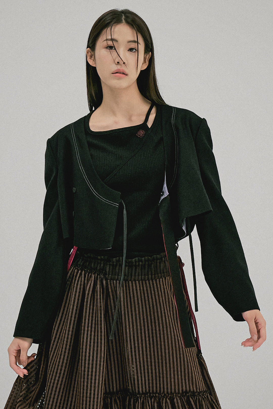 Product Description: It is a cropped-length jacket. The design reinterprets the proportions and silhouette of a traditional hanbok jeogori (jacket). Details include the back seam of the jeogori on the sleeves, a collar expressed through stitching, and a curved slit on the back inspired by the traditional dangui, adding a distinctive touch.