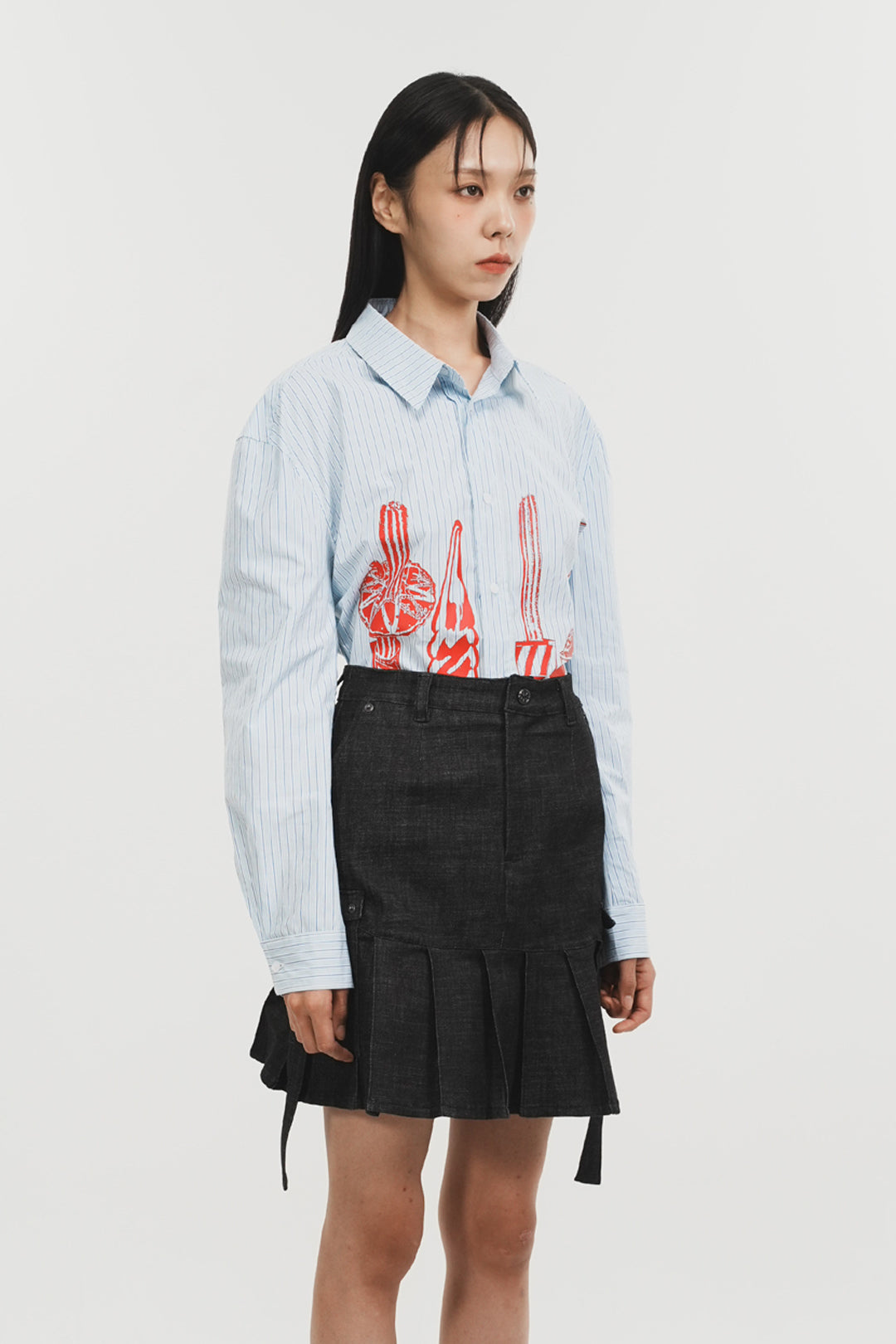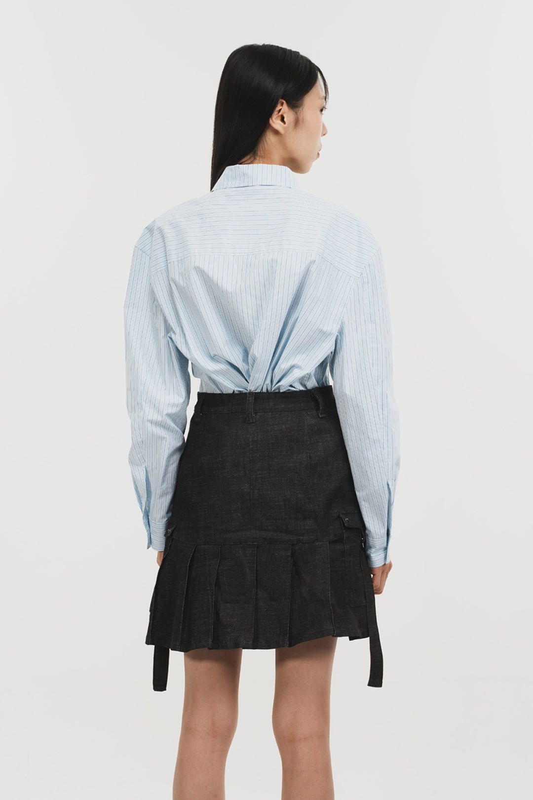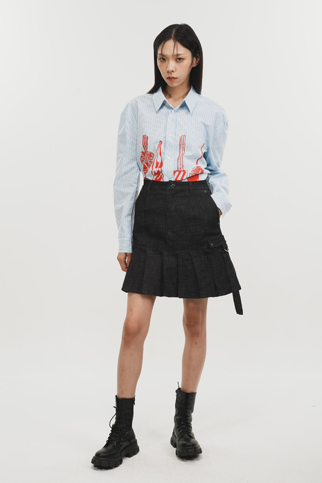 Product Description: The denim pleated skirt, featuring side pocket details, showcases an A-line silhouette and short symbol-engraved snaps, creating a sophisticated look.