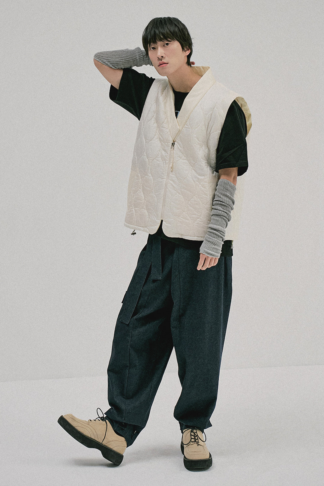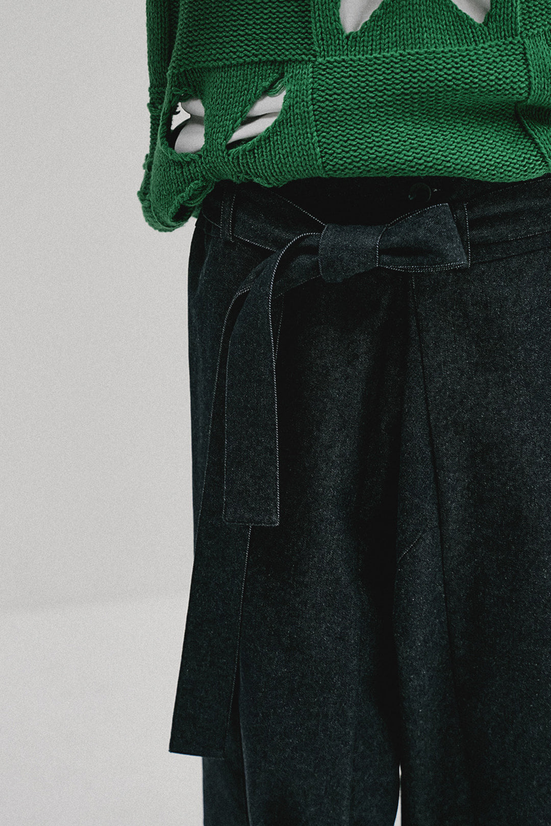 Product Description: These pants are made from denim fabric. They retain the original shape of traditional hanbok sapok pants, with extended waist ties to showcase the elegance of hanbok.