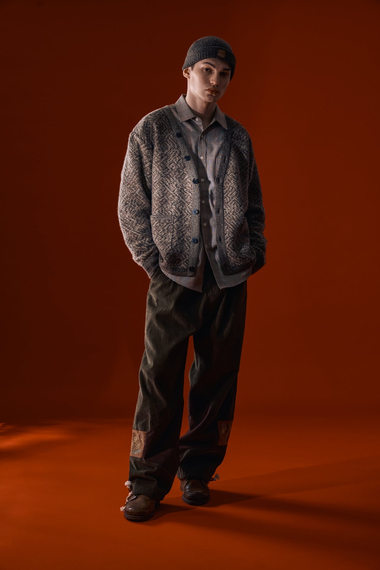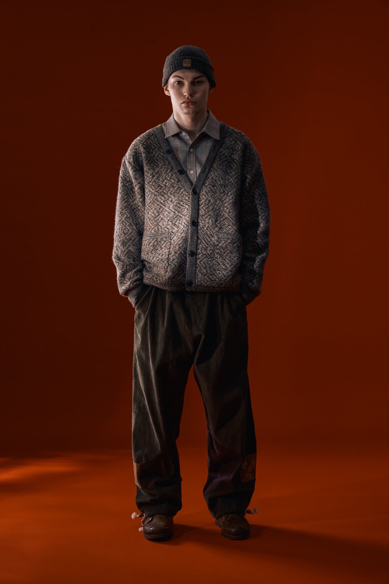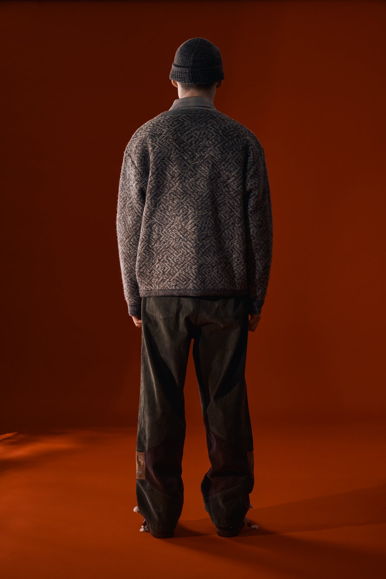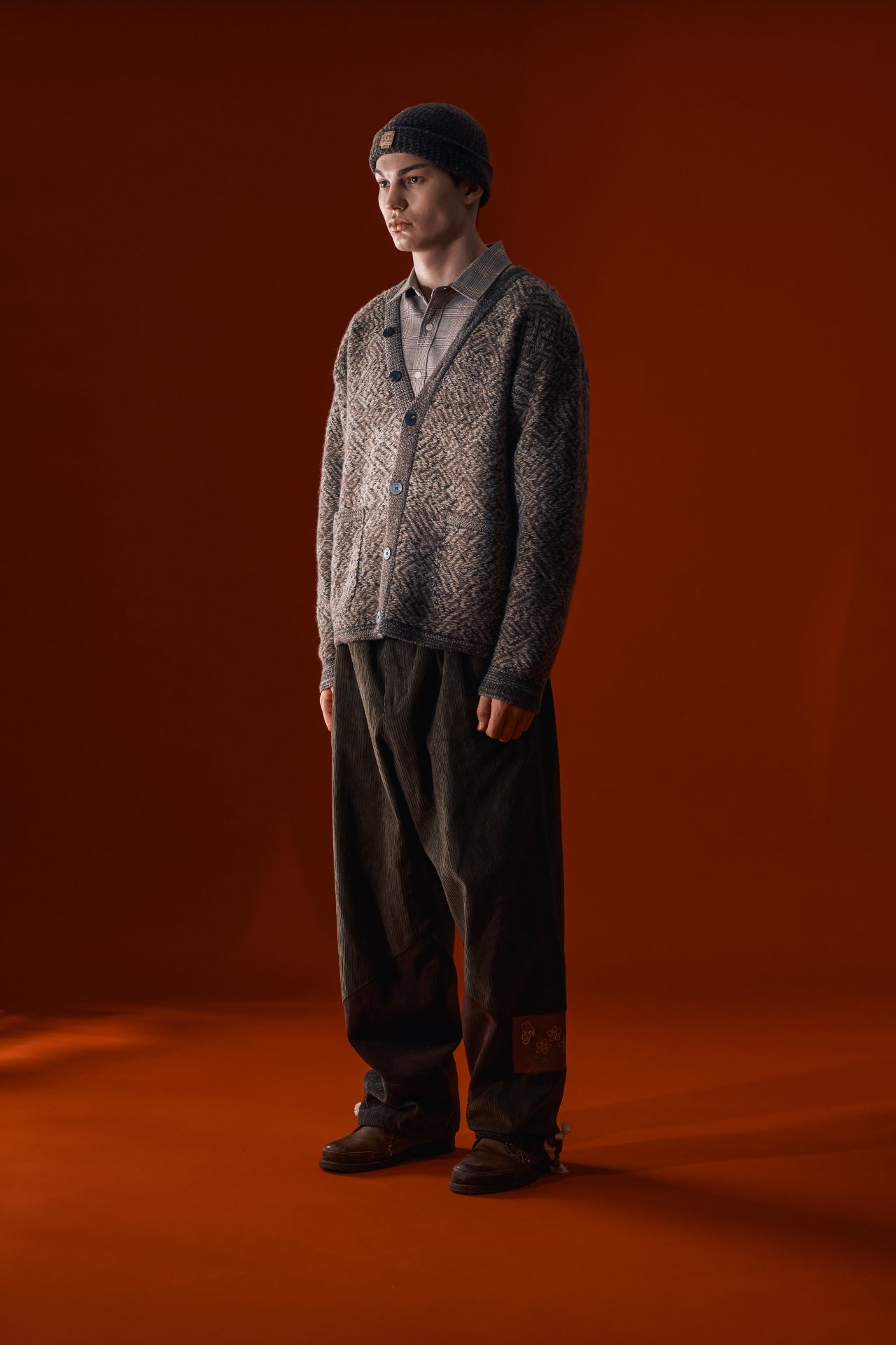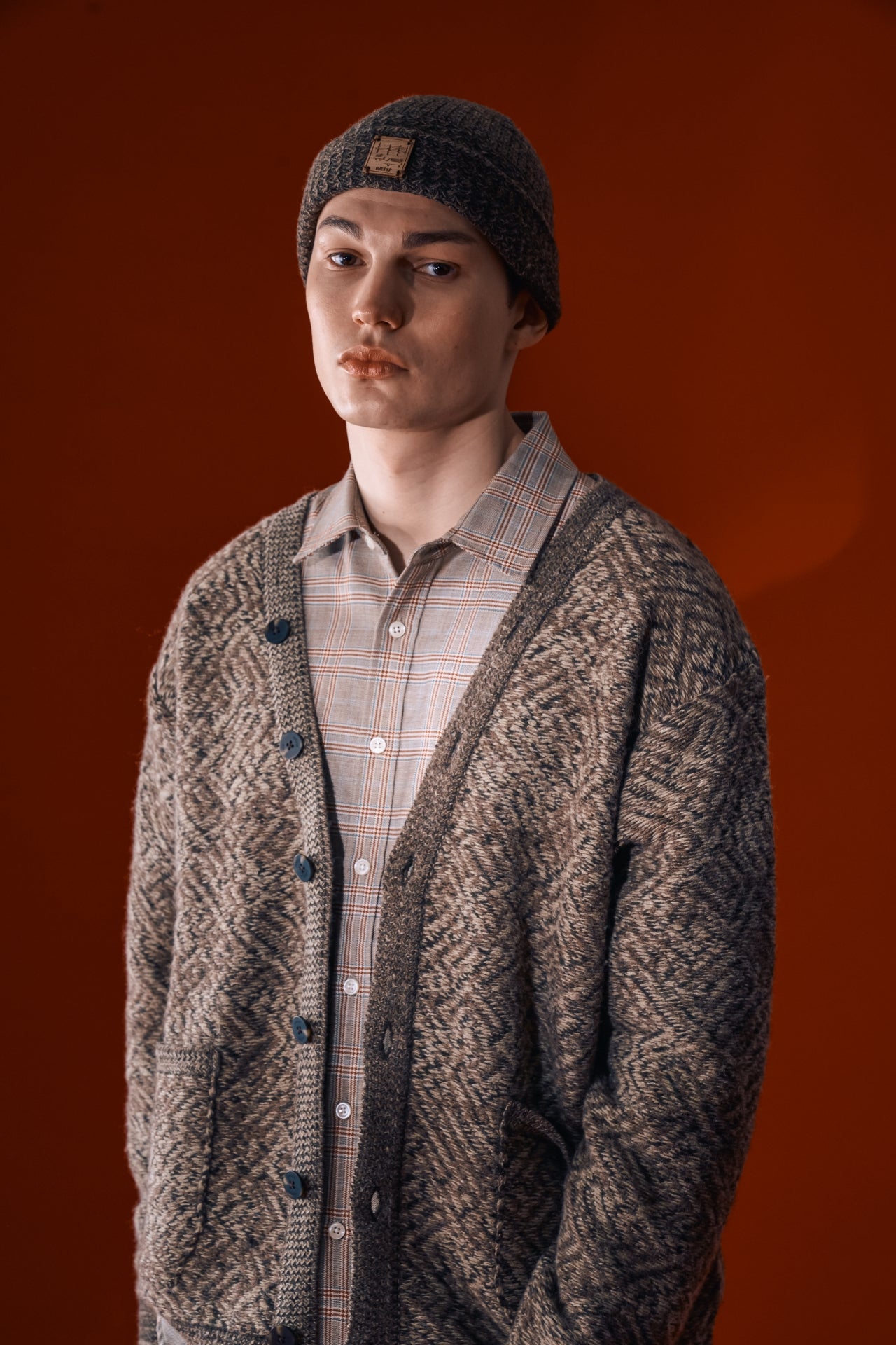 Product Description: This piece is knit with mixed-coloured yarns, creating a rich depth of tone and a unique, vintage-inspired knit texture. The timeless craftsmanship is complemented by a laser-engraved walnut wooden label, adding a natural, artisanal touch that makes each item feel one-of-a-kind.