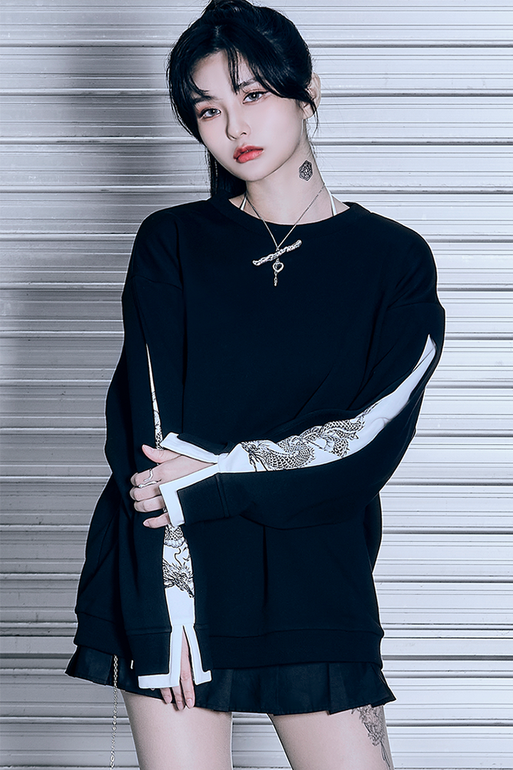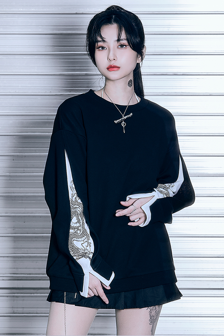 Designed with a double-sleeve pattern, the dragon motif peeking through the layers adds a unique touch, creating a sweatshirt with a distinct streetwear aesthetic.