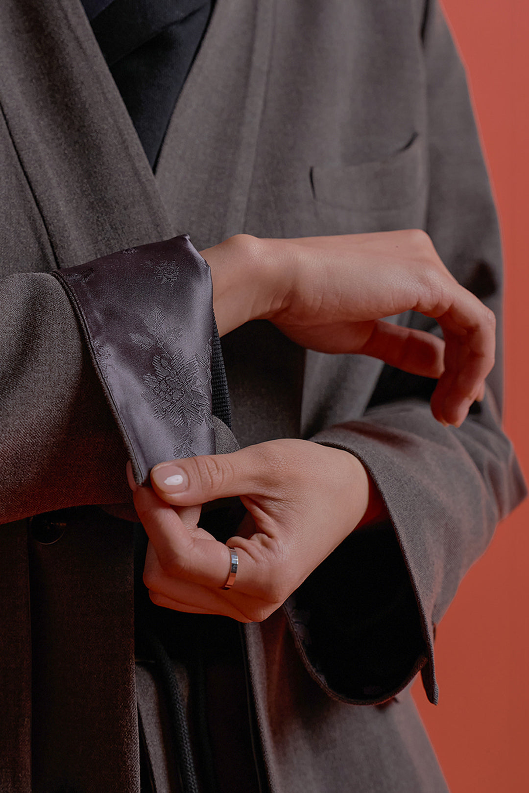 Product Description: This design is a modern reinterpretation of the traditional wooden-collar style. The signature “Kkomark” button closure represents the hanbok goreum (traditional knot). Hanbok yangdan fabric is used as a contrasting detail on the inside of the sleeves, behind the goreum, and on the back of the pockets.