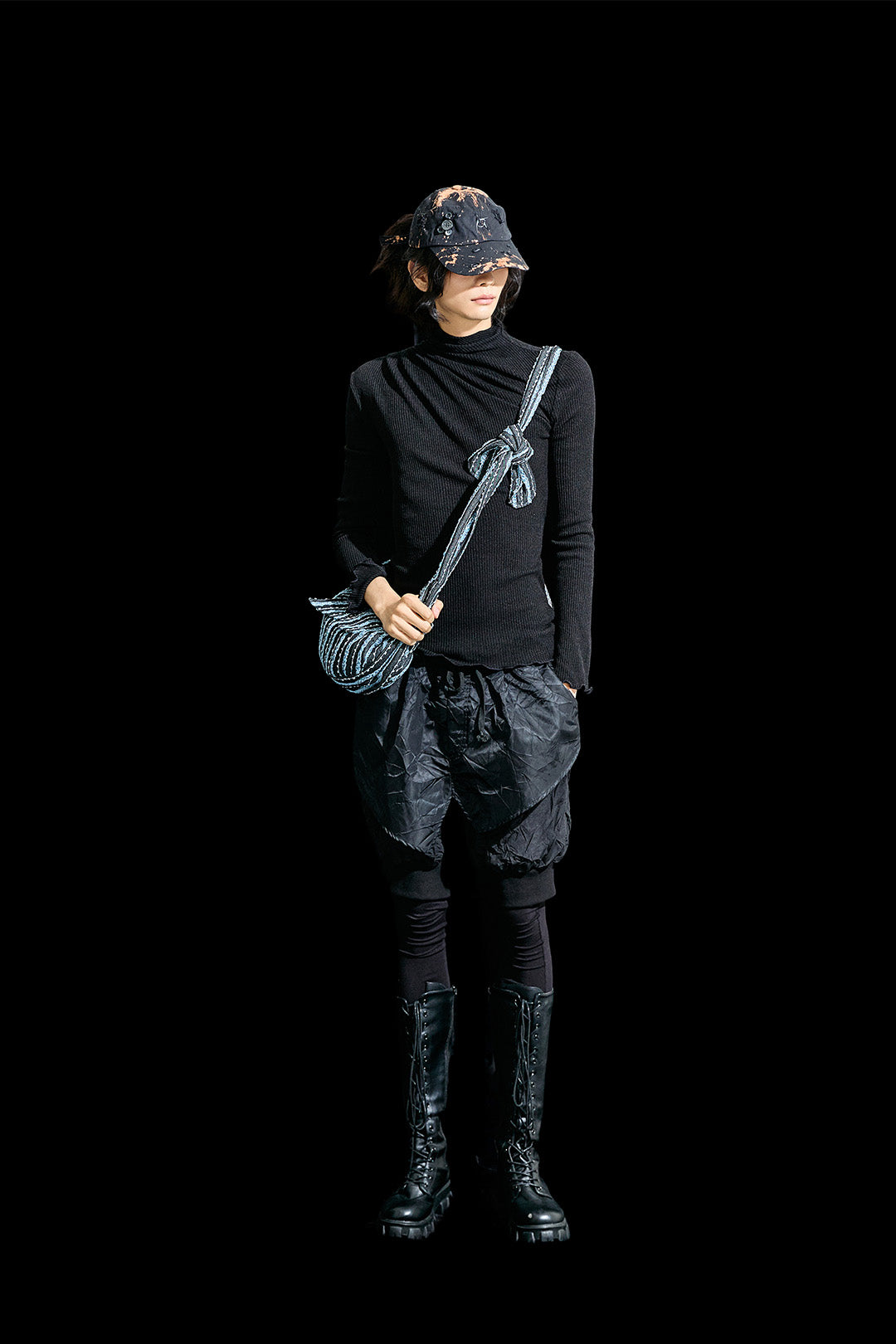Product Description: This piece features a visor that allows for drapery-like styling, creating a flowing and dynamic silhouette. It offers a neat yet distinctive look, balancing simplicity with unique design details. Versatile in wear, it can be layered over other pieces or styled as a standalone one-piece with a long shirt for effortless, modern elegance.