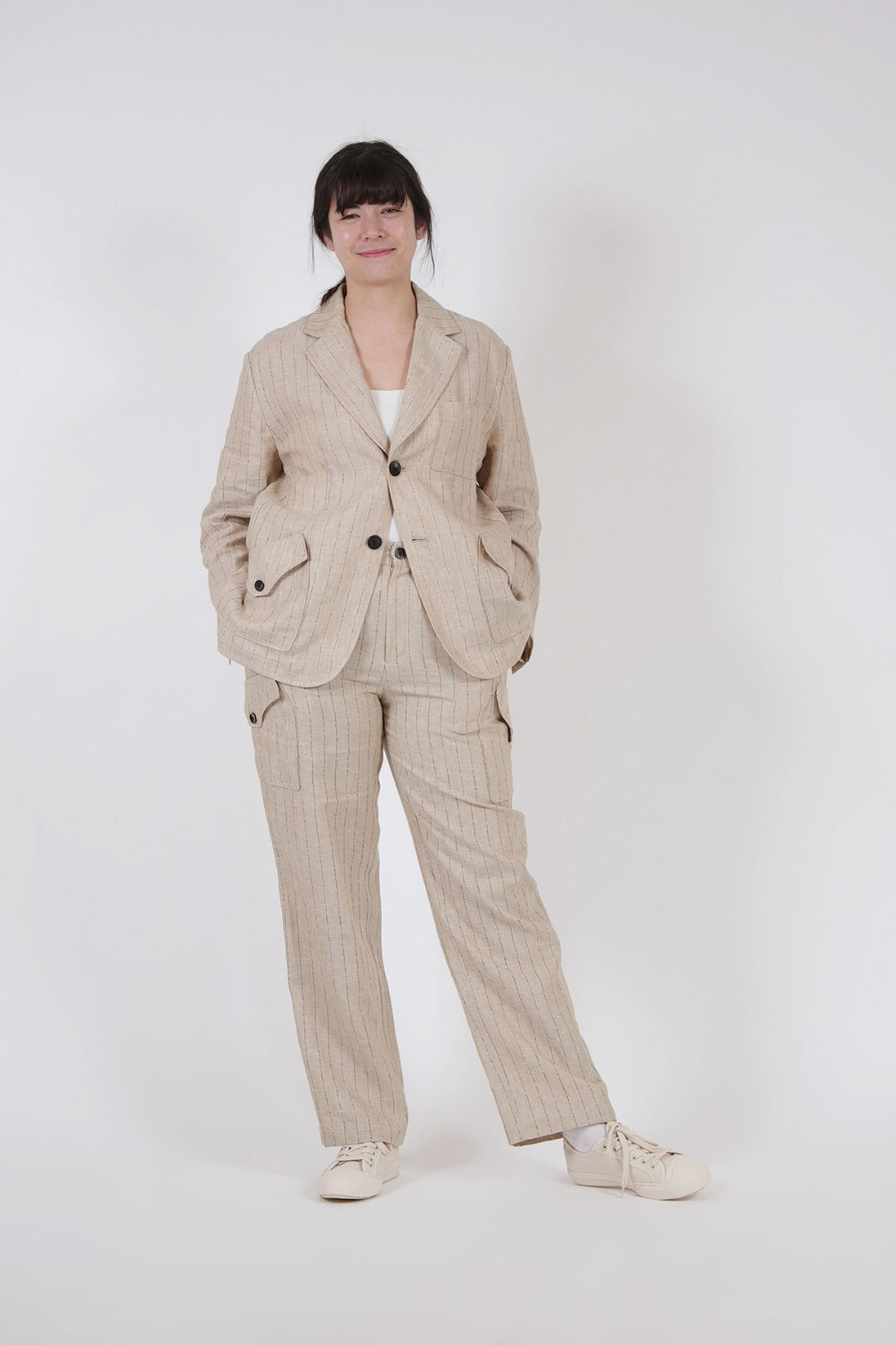 Product Description: Linen cargo pants perfect with a linen jacket setup. Folded pocket flaps keep them light, and an adjustable belt offers a comfy fit—no extra belt needed. Made from 100% linen for a cool summer.