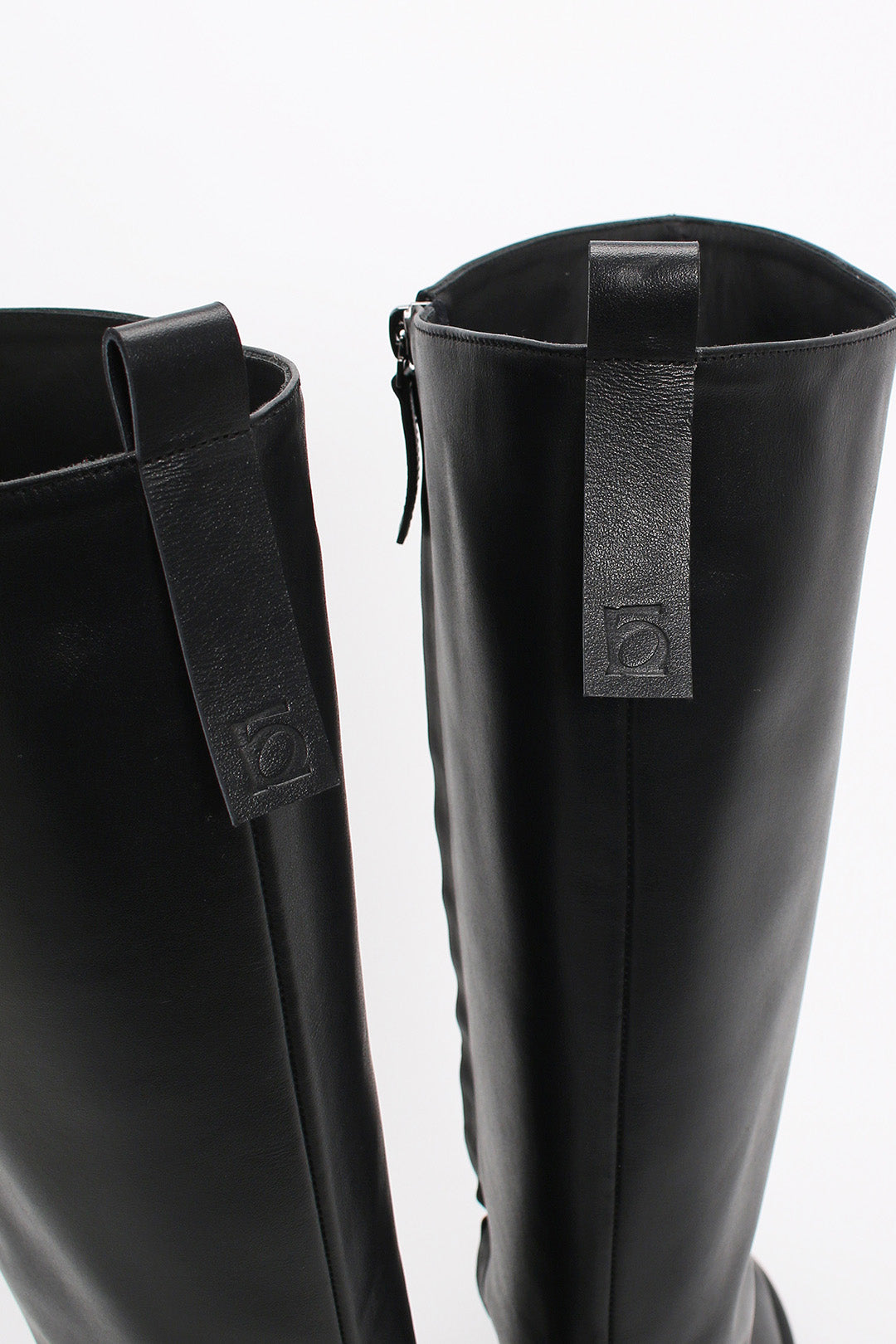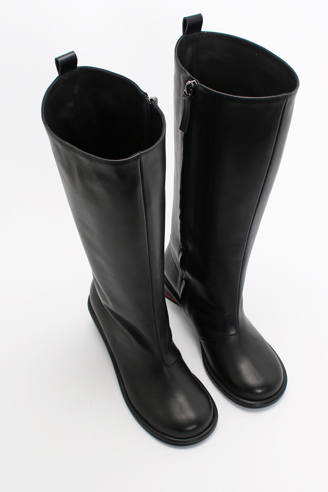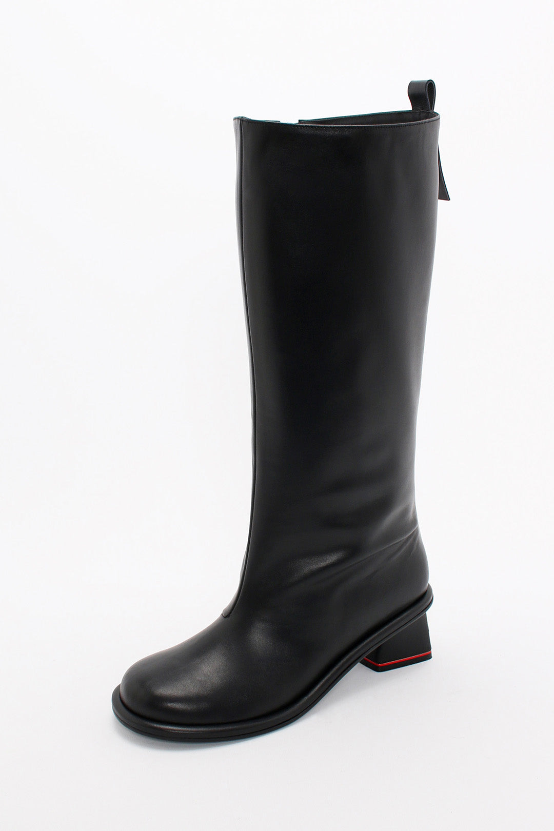 Product Description: The Moon long boots complete any look with a distinctive silhouette. A bold piping detail that traces around the front and sides accentuates Finoacinque’s signature rounded shape, while the subtly curved heel with a red line and a small engraved Finoacinque symbol on the back tab add a refined statement—even from behind. Made from glossy premium cow leather and soft camel-colored lamb leather, each pair is carefully stitched for a sleek and luxurious finish. The wide shaft design allows a relaxed fit around the leg, ensuring comfort and an elegant, elongated look.