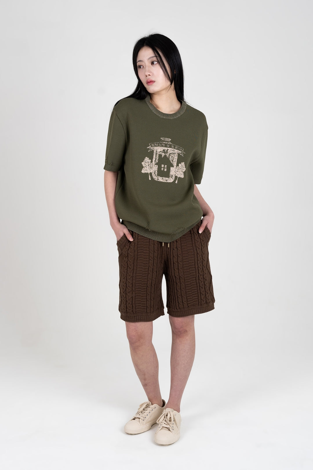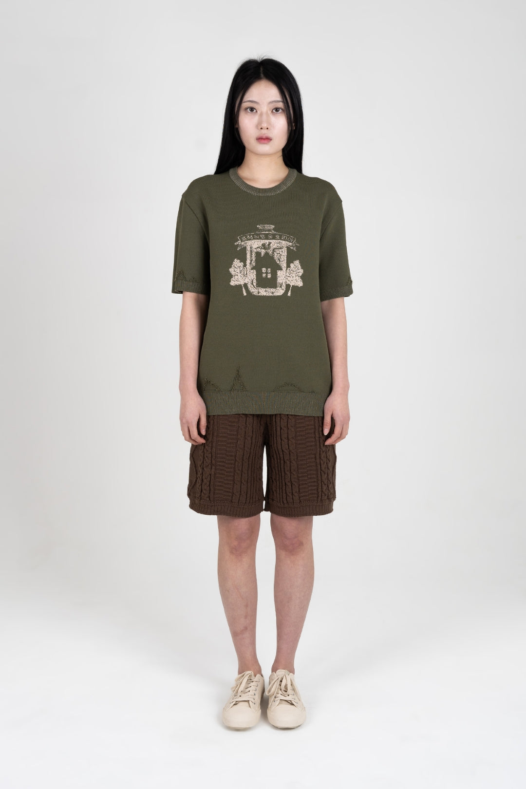 Product Description: Envisioning the transformation of nature into a utopian new city, this piece explores the idea of carving out one’s own space—much like clearing a forest to build anew. The concept comes to life through intricate jacquard knitting, while vintage-style, roof-shaped triangles at the sleeve ends and hem symbolise the gradual, step-by-step construction of a rising cityscape.