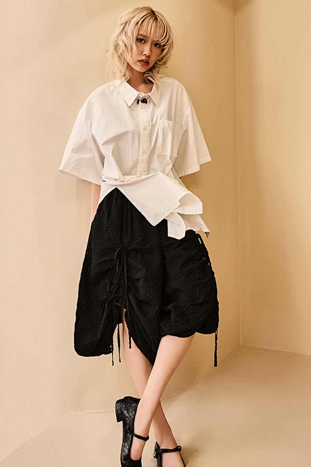 Product Description: This is a skirt pants featuring shirring details at the front and back.