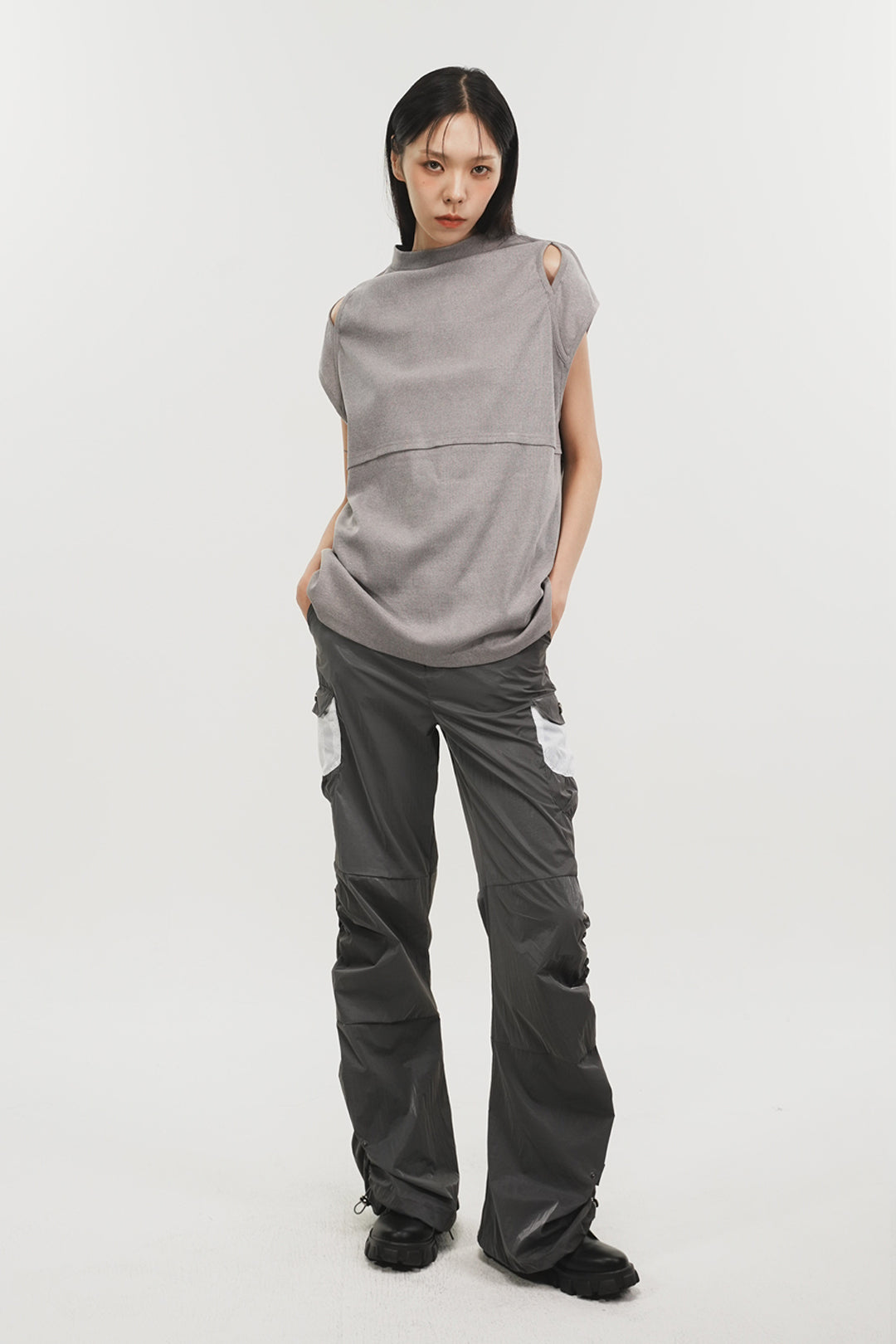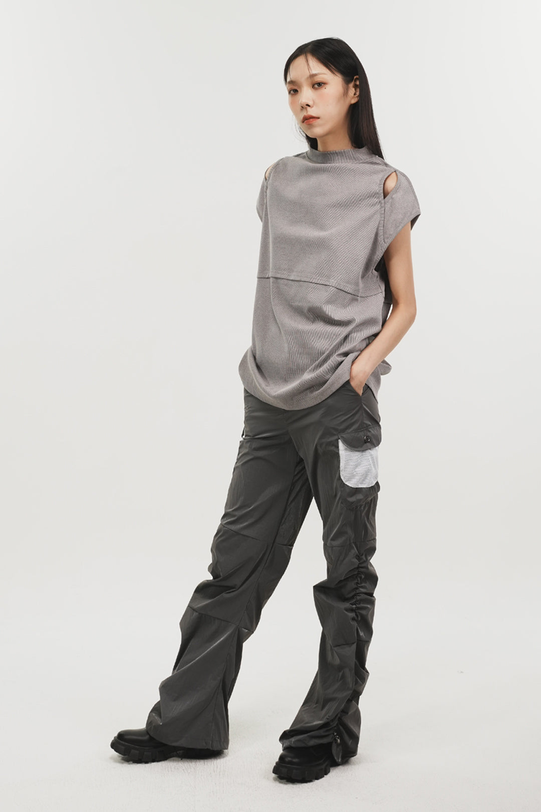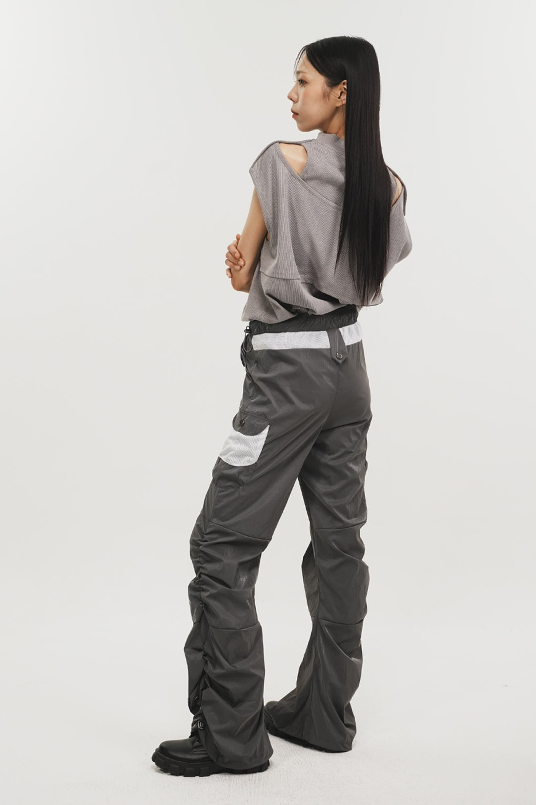 Product Description: The nylon pants, featuring mesh-accented side pockets as a key detail, are designed with side shirring details and an elastic waistband, offering both comfort and a sophisticated.