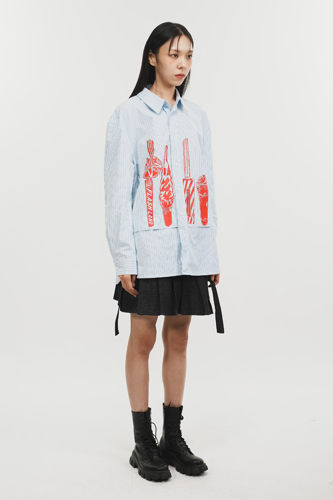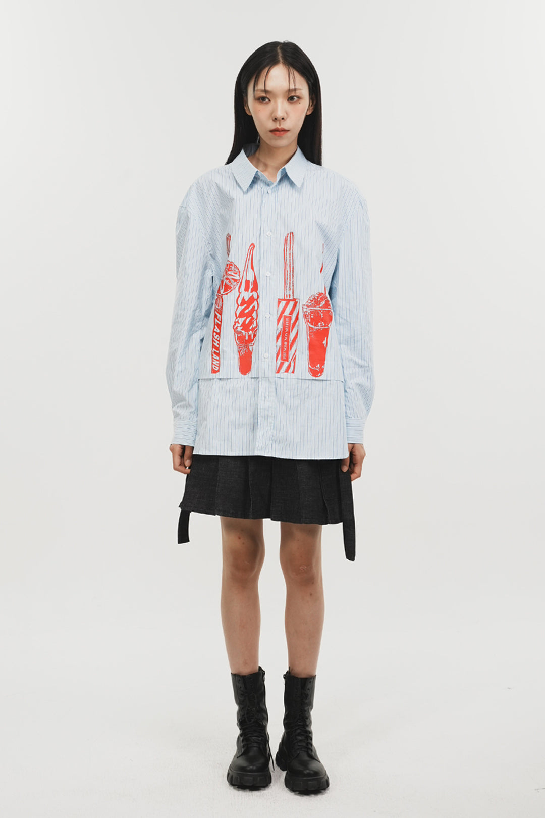 Product Description: The striped shirt, featuring digitally printed snacks, is designed in an oversized fit with fly details, creating a kitschy style.