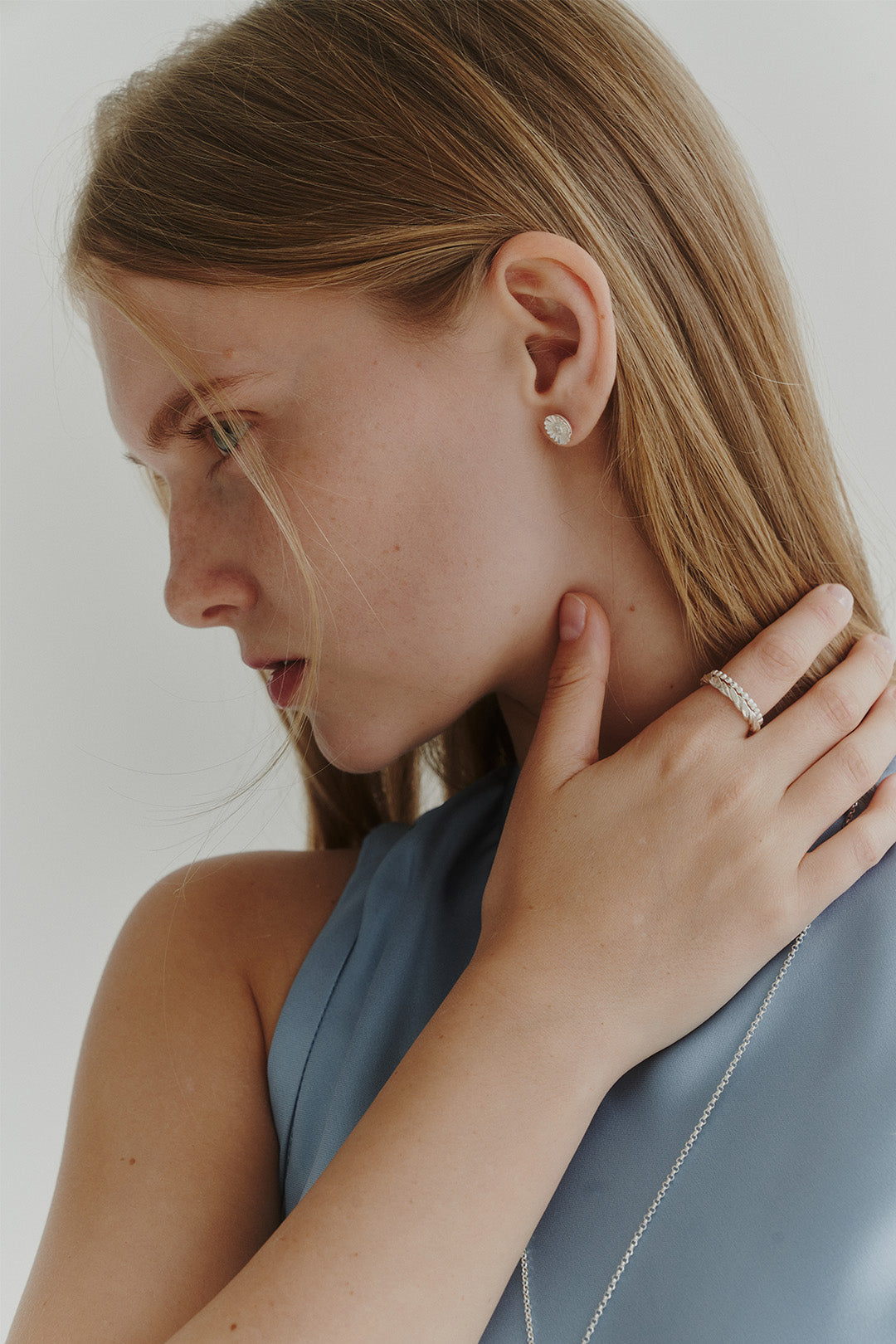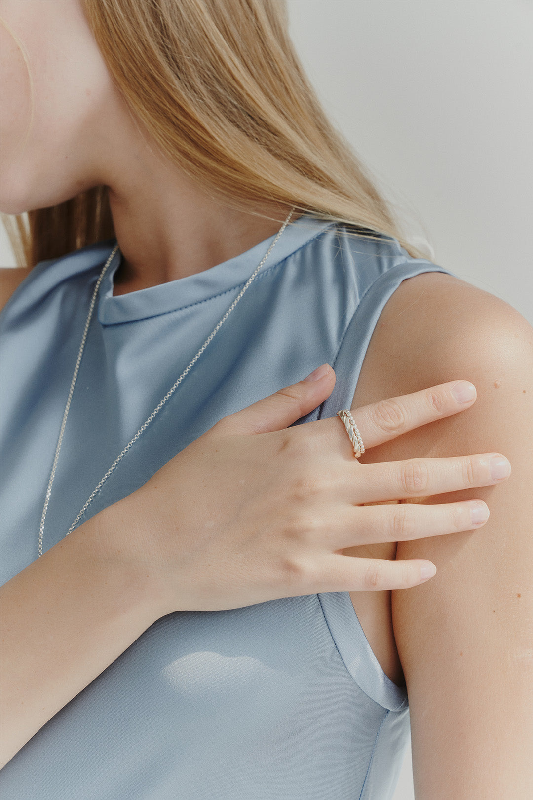 Product Description: This is a layered ring inspired by the gentle waves swaying under the moonlight and the droplets that break upon them. Each piece can be worn individually, or layered together to create a sophisticated and voluminous look, making it a versatile 2-way piece that can be styled as a daily accessory with any outfit. The sturdy yet soft-edged rope design, combined with the rhythmic arrangement of delicate dot shapes, creates a chic look that's not too bold, allowing you to enjoy it for a long time without it ever feeling overdone.