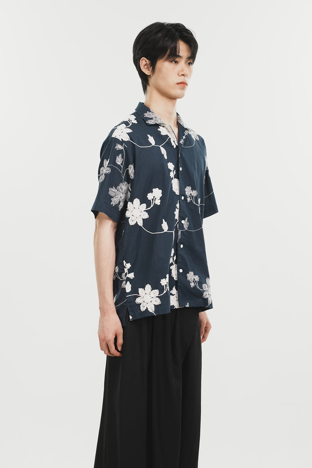 Product Description: The open-collar shirt, featuring floral embroidery on both sides, showcases a boxy silhouette and a collar logo embroidery, creating a distinctive style.