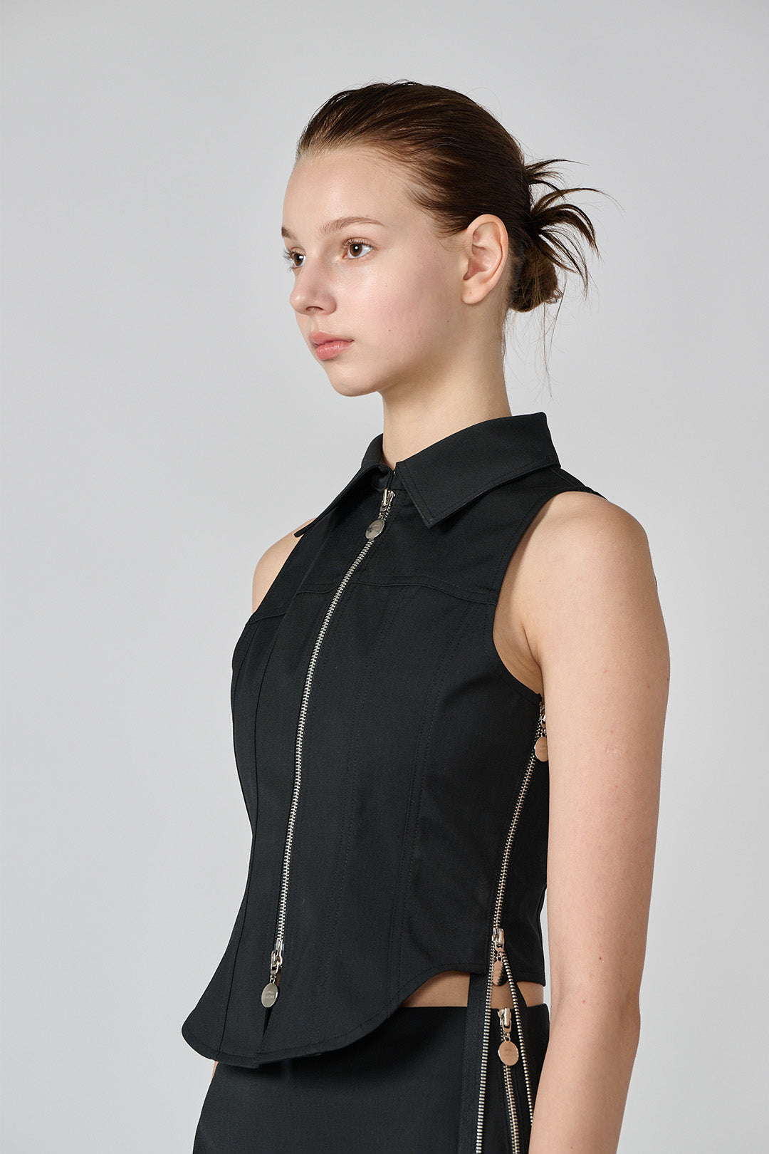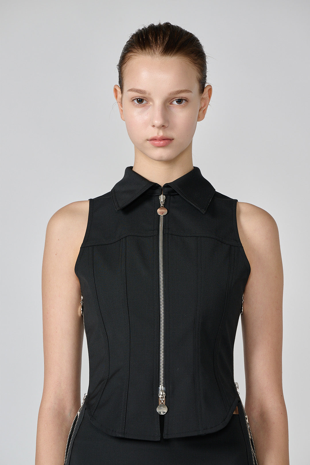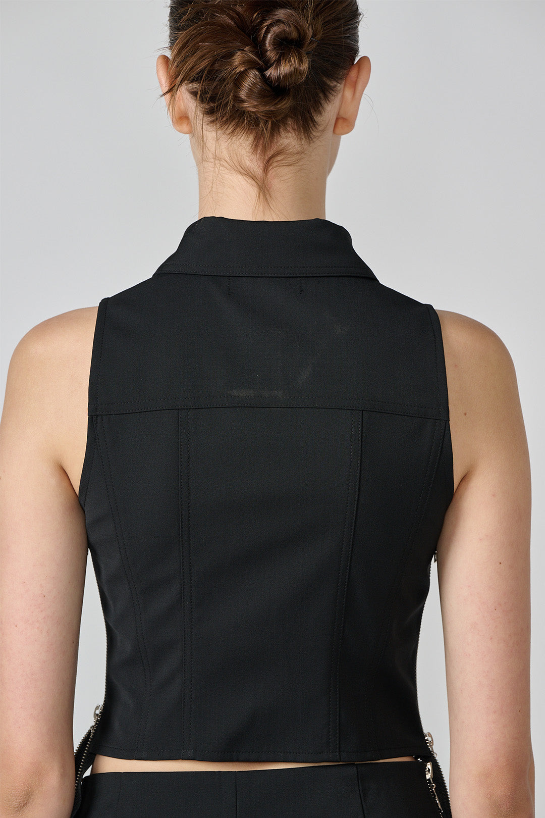 Product Description: The Wool Vest from the Lunecave 2025 spring collection reinterprets classic lines with a rock chic feel, crafted using tailored production methods and double-layered wool fabric made through wool milling. The entire process—design, pattern-making, and production—is carried out in-house by Luncave, ensuring a product that is 100% domestically produced. This vest is created with a sewing technique specifically designed to complement the wool fabric, showcasing Luncave's distinctive silhouette and attention to detail.